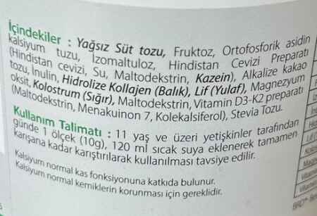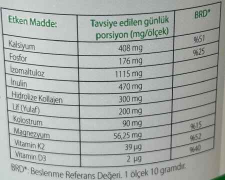 K2 ve D3 vitaminleri ve inülin ile şeker ve tatlandırıcı içerir.